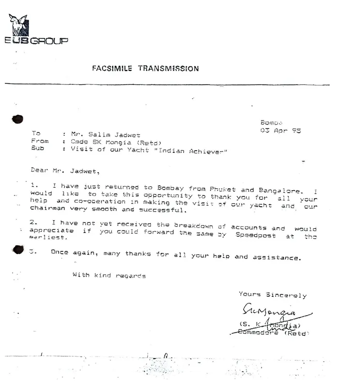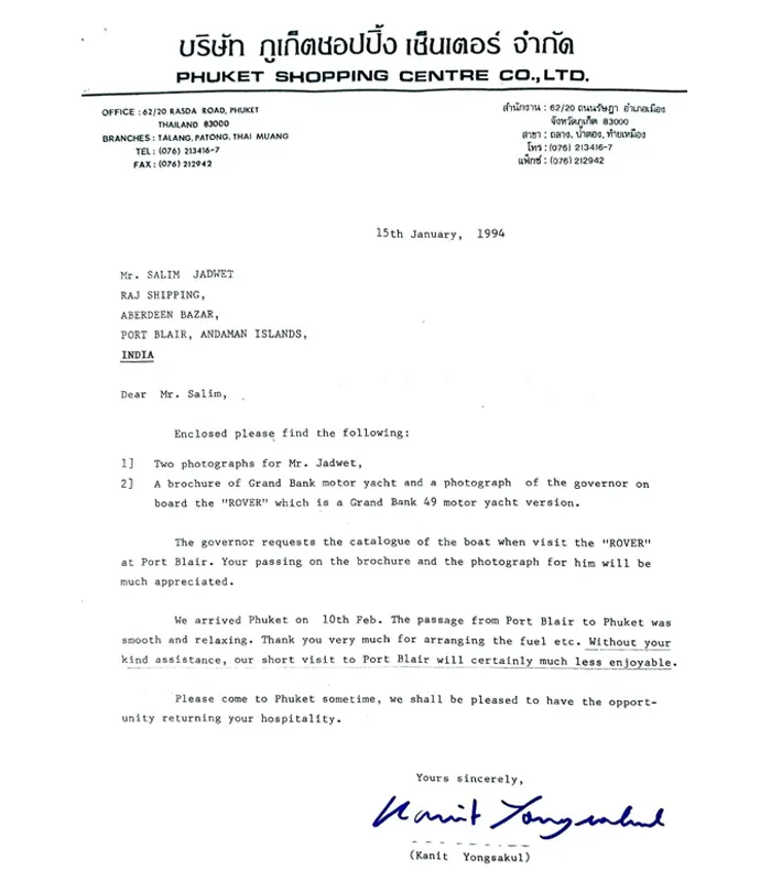 "I have just returned to bombay from Phuket and Bangalore, I would like to take this opportunity to thank you all all your help and cooperation in making the visit of our yacht and our chairman very smooth and successful. "
