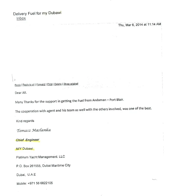 "Many thanks for the support in getting the fuel form Andaman - Port blair, The cooperation with agent and his team was one of the best. "